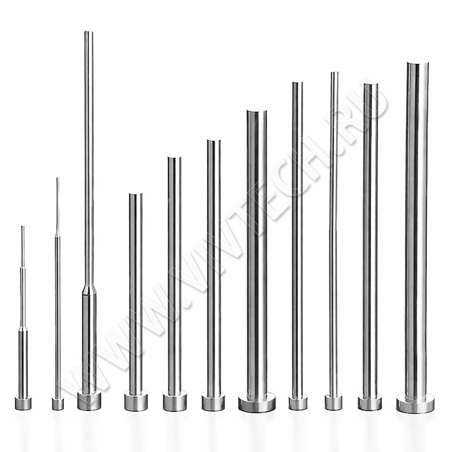С конической головкой: Их главное преимущество — компактность. Коническая шляпка занимает меньше места в плите, что позволяет разместить толкатели плотнее в формах с ограниченным пространством. Поставляются в закалённом варианте.