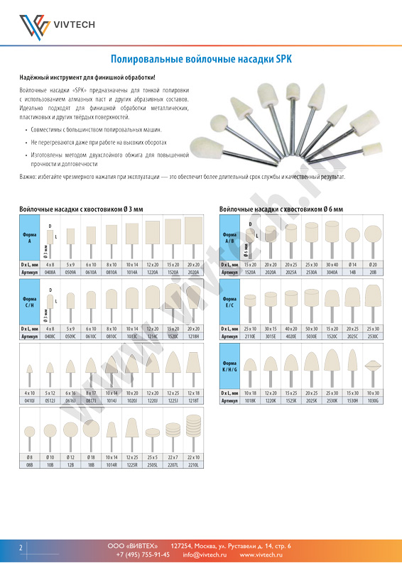 Войлочные насадки «SPK» предназначены для тонкой полировки с использованием алмазных паст и других абразивных составов. Идеально подходят для финишной обработки металлических, пластиковых и других твёрдых поверхностей.